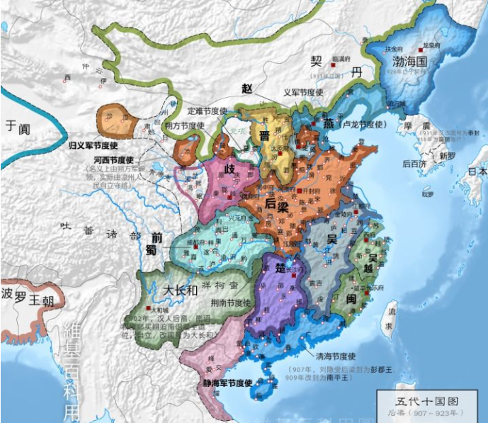 在北方,除了晉、燕,在陝西甘肅的那個“岐”,本是唐政府西邊的鳳翔節度使李茂貞,隨着唐的滅亡,李茂貞也自立以表示對抗,不過也就是在陝西吃喝玩樂而已,並沒啥大作為。