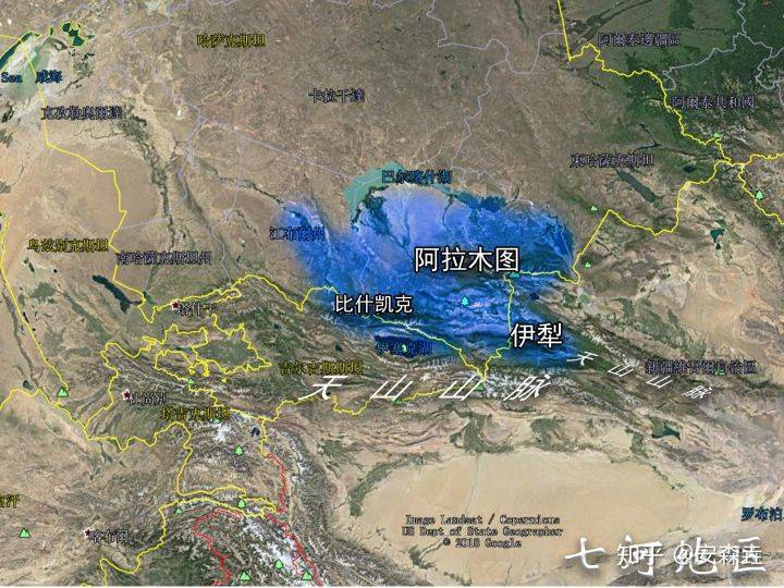 在乾燥的中亞地區,大部分都是如“沙陀”這個名稱一樣,遍佈戈壁沙漠,但是隻要有山的地方,就存在冰川融水的涓涓細流,所以“天山南北好牧場,戈壁荒漠變良田”這不是瞎説的,比起天山南部如龜茲(庫車)、焉耆、阿克蘇這樣的綠洲,天山北部因受到大洋氣流影響,就有着更為巨大的江河了,下面放的這個,就是那個生活過烏孫、悦般以及那個在怛羅斯之戰中倒戈的葛邏祿的——七河流域,或者叫“伊犁河谷區”——