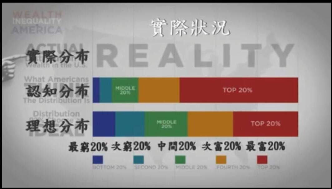 假設把人口依照富有程度分為五等分,他們認為財富分佈的狀況是什麼。他又問,理想的分佈該長什麼樣。