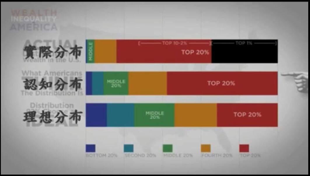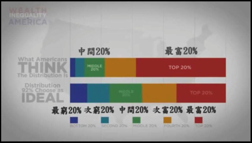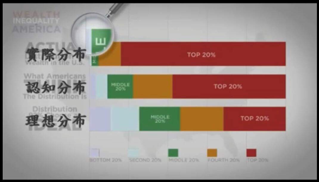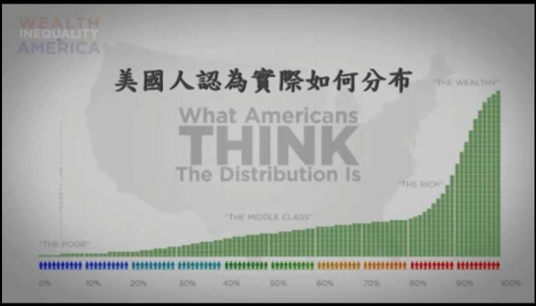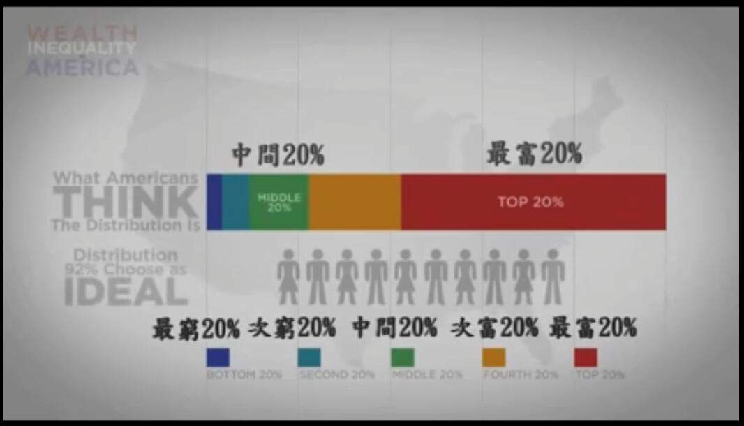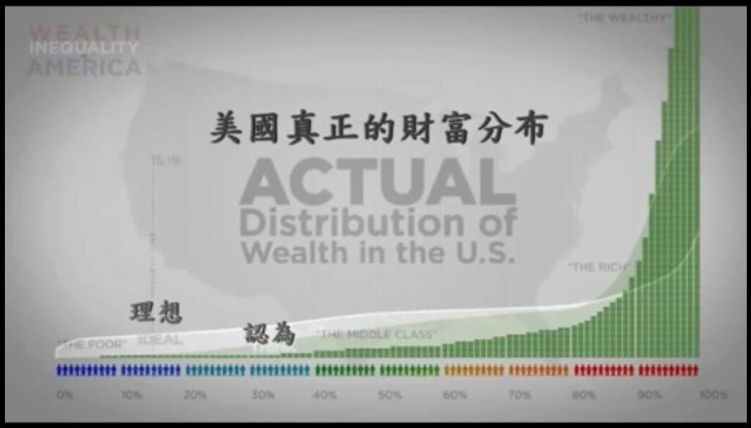 更甚的是,最富的1%擁有的財富,比九成美國人認為的最富20%共有的還多,非常驚人。