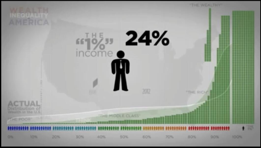 2、30年來,貧富差距只有更加懸殊,這1%的首富幾乎是全國1/4的收入。在1976年,他們的收入只佔全國的9%。也就是説,30年來他們的收入增長了三倍。這1%擁有美國一半的股票、債券、和共同基金。底層的50%美國人持有僅為0.5%。這意味着,他們沒有投資,只能勉強餬口。