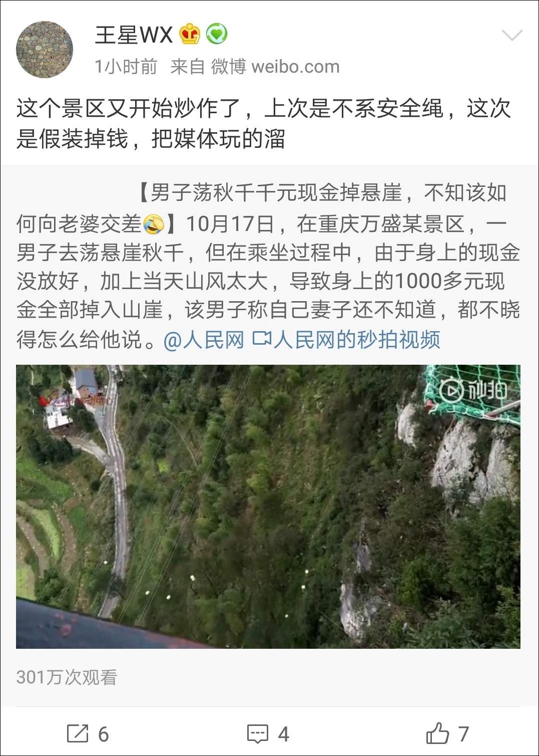 北京時間副總裁王星就發微博稱,“這個景區又開始炒作了,上次是不繫安全繩,這次是假裝掉錢,把媒體玩的溜。”
