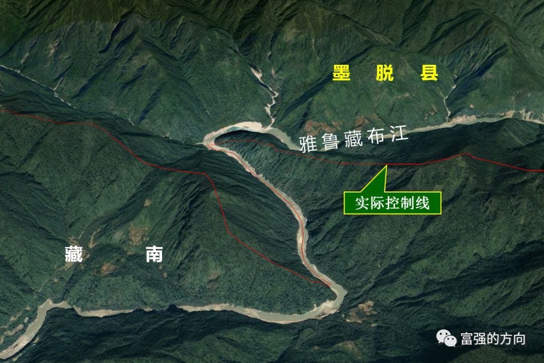 採用這個方案,隧道入口設在大拐彎的上游——林芝的派鎮處,構築若干條隧道,穿過山體直達雅魯藏布江下游,即墨脱縣城下游約35公里處,也即:隧道出口在中印實際控制線的中方一側江邊。如下圖: