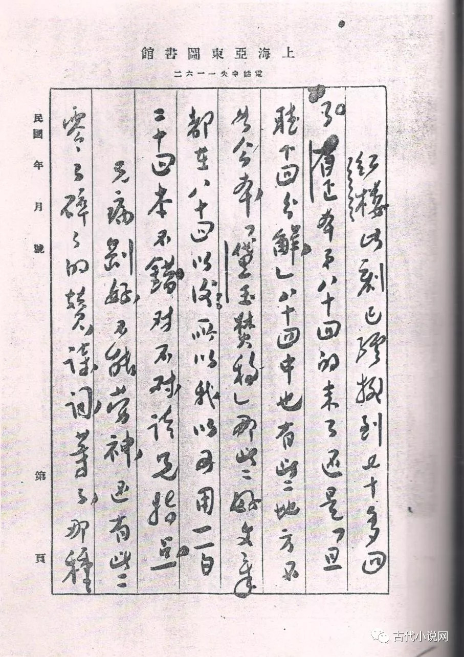 但紅樓賣預約,一是靠水滸、儒林的信用,因此二書排印校對輿論對之尚佳,二是紅樓盼望早出版者較水滸、儒林尤著,來問的甚多,即賣預約,即有定期出版,盼望者較有着落,可以安慰。三是預約較特價尚要從廉,於買者亦殊經濟,四是排版並紙版費已近一千元。