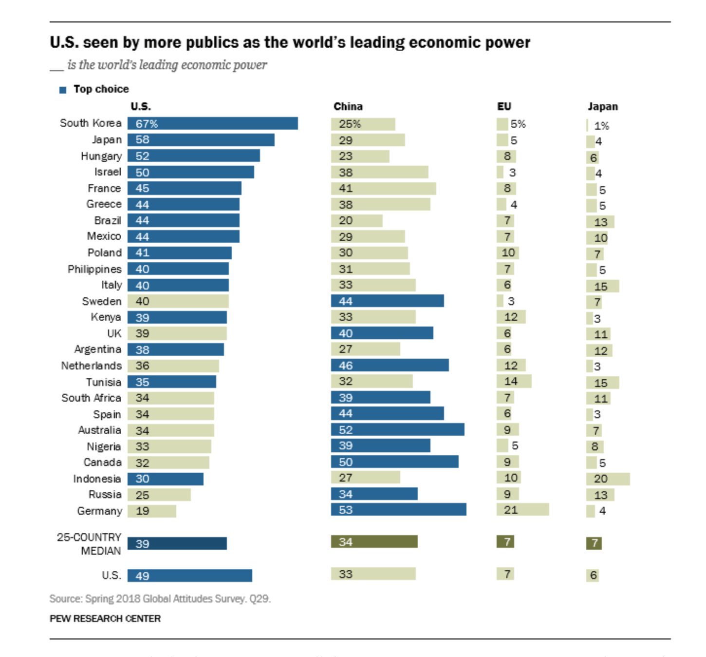 經濟上,34%的人認為中國是現今世界經濟的領頭人,和美國的39%差距並不大。但在拉丁美洲及亞太地區,美國依舊擁有絕對的被認可地位。在整個亞太地區,只有澳大利亞認可中國。在非洲的肯尼亞,尼日利亞,及南非,認同中或美是領頭羊的人,都不足4/10。