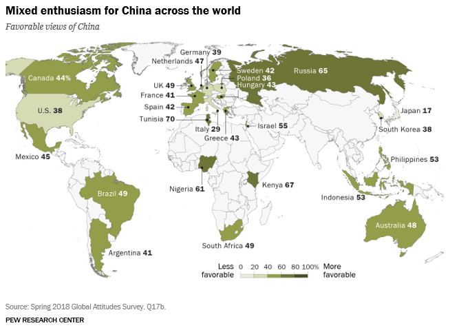 世界範圍內,人們對中國的態度不一。在跨越25個國家的民調裏,按中間值而言,有45%的人表達了對中國的好感,有43%表示了不喜歡。17年,美國人對中國好感達到了44%,今年小幅下降到了38%。