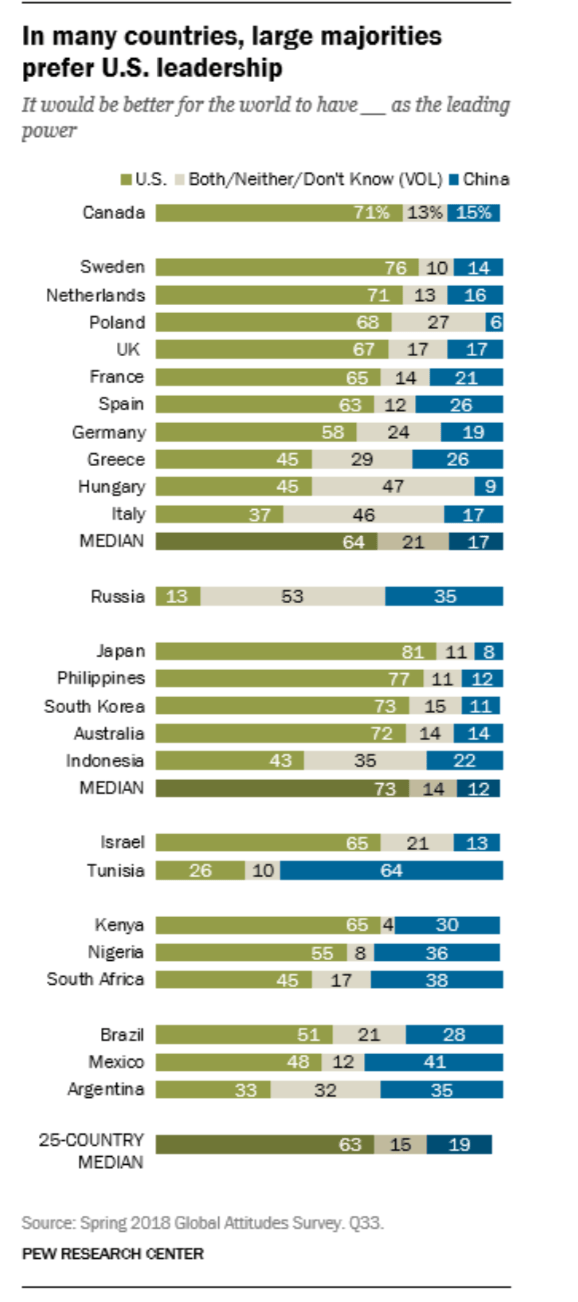 但是喜歡和認可是一方面,服從又是另外一方面了。在講到未來的世界帶頭人的時候,25個國家63%的人更偏好於美國,只有19%的人選擇了中國。