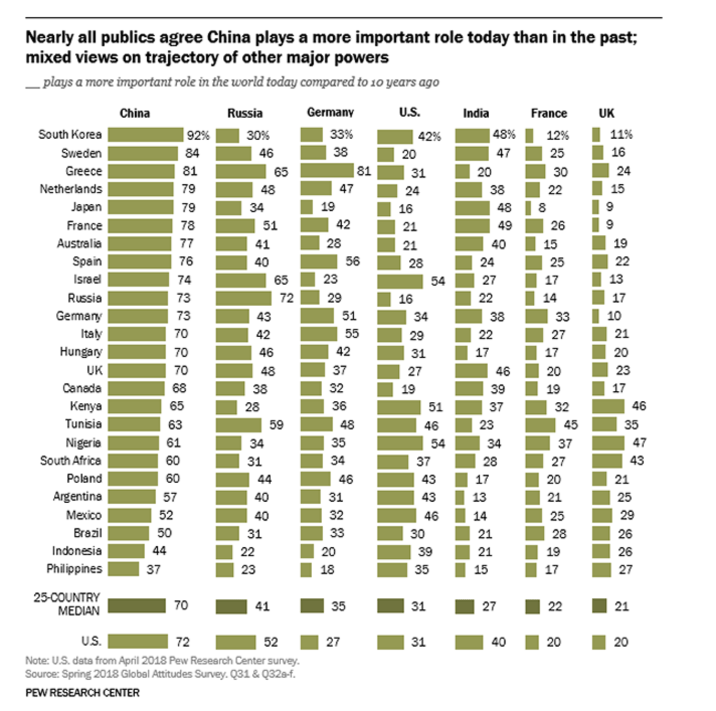 1.只有8%的人認為中國在過去十年所扮演的角色愈加不重要了,且這8%的人分佈在7個國家。