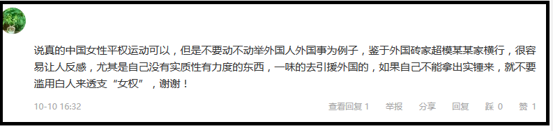 再者,由於西方女權運動的發展時間早於我國,所以許多作者在講到女權時,會引用國外的例子,或者是西方某些思想家的言論。於是就有讀者説:“為什麼要提女權,這是西方白左那一套,臭不可聞,不要自降身段去跟從他們的話語體系。”