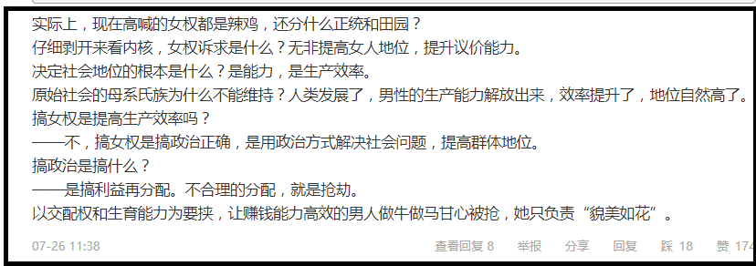 所以,如下的言論,在數據缺失且脱離中心的情況下,有“輕率概化”之嫌疑。至於其他類似的“田園女權”,“女權就是要壓倒男性”等言論,在我看來是同理。