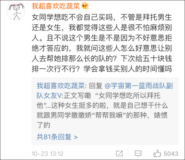 情感博主@蒼南派 今天發了一個網友的投稿:食堂裏有個飯很紅,每次排隊人都很多。男朋友幫她排隊過幾次,女生心疼男朋友,後來就不吃了。結果,今天男朋友居然排隊幫他的同班女同學帶。因為女同學想吃拜託他,他就答應了。