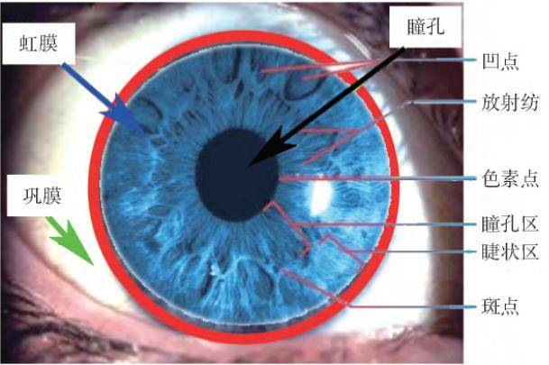 人的眼睛外觀由鞏膜、虹膜和瞳孔3部分構成。虹膜是位於鞏膜和瞳孔之間的環形區域,約佔眼睛總面積的65%,虹膜包含了豐富的生物學特徵信息,而且在幼年固定下來後維持終身不變,可以説是一個人的終身身份證。