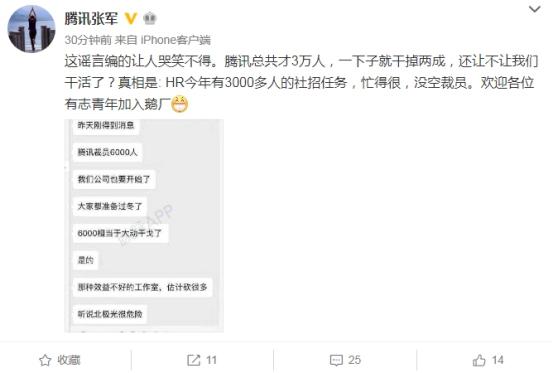 關於騰訊裁員的流言也貫穿了整個9月。9月初,曾有傳聞稱騰訊將裁員6000人,騰訊公關總監張軍闢謠稱:“HR今年有3000多人的社招任務,忙得很,沒空裁員。歡迎各位有志青年加入鵝廠”。