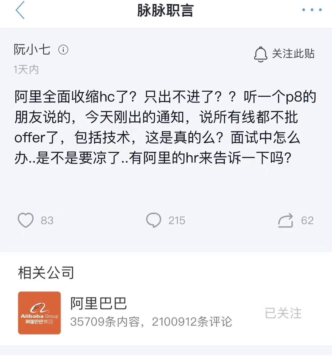 近日,有應聘者在職場社交應用脈脈上留言表示:阿里已全面縮減headcount(人員編制),所有業務線都不批offer,包括技術,近期招不上來的可能就會被砍掉了。
