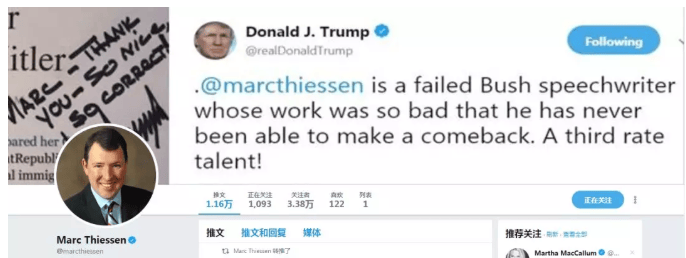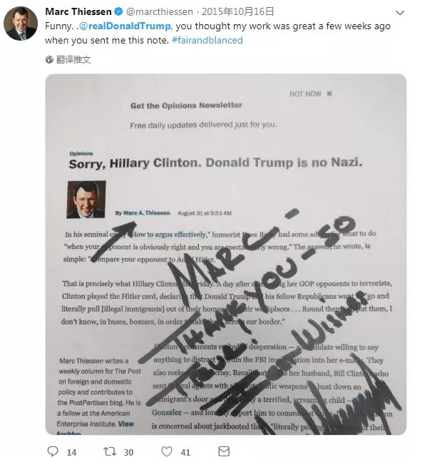 圖片上顯示當時泰森寫了篇為川普辯護的文章,説川普不是納粹份子。而川普直接在報紙上給泰森寫了兩句表揚的話“謝謝你,馬克 - 你説的太正確了!”