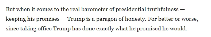 ”但是,當談到總統誠信的真正晴雨表 - 信守承諾時 - 川普是誠實的典範。無論好壞,自上任以來,川普完全按照他所承諾的那樣行事。“