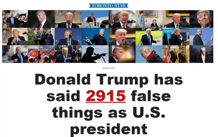 説到川普是否謊話連篇,有多個媒體都有發言權,包括《華盛頓郵報》、政治事實核實網站politifact,他們都在川普上任後,核實他在每日的公開談話、推特上發佈的信息是否正確,統計他説錯、作虛假或誤導性陳述的次數。據稱數字很可觀,《華盛頓郵報》在9月12日前就已經統計了5001條川普所作“虛假或誤導性陳述”。