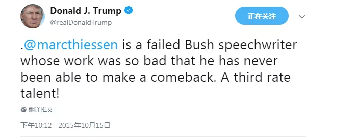 馬克·泰森是共和黨人,曾經擔任過美國前總統小布什的演説稿撰寫人。兩人早在2015年就在推特上交鋒過。