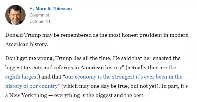 這篇評論文章的作者是美國保守派智庫美國企業研究所的研究員、華郵專欄作家馬克·泰森(Marc Thiessen)。他的這篇發表於10月11日的文章確實是以“川普可能被人們銘記為美國現代歷史上最誠實的總統”開頭的。