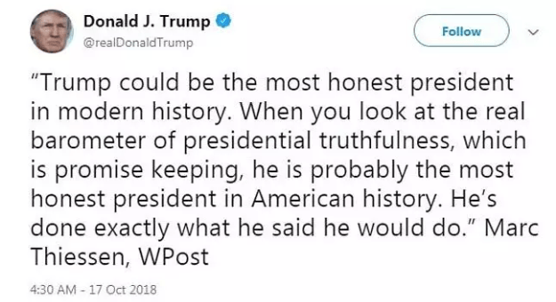 “現代歷史上最誠實的總統”這樣的評價不可謂不高。因此得到川普的喜歡並作轉發就不奇怪了。