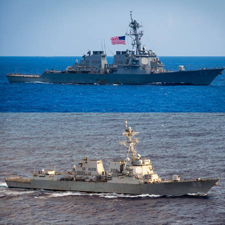 但為什麼總是成雙結對呢?“提康德羅加”級和“伯克”級都是戰鬥力強大的戰艦,具有均衡的海空戰力,反潛能力也很強大。換成其他國家,一艘單挑一個國家的海軍都不見得不敢,但中國不同,不可造次。雙艦的戰鬥力比兩艘單艦更高,組成的水面戰鬥羣(Surface Action Group,簡稱SAG)是戰鬥力僅次於航母戰鬥羣的海上戰鬥集團,儘管依然不可能獨挑中國海軍,但畢竟放心多了。更大的編組戰鬥力更強,但挑釁性也更大,容易玩過線。除非真是戰鬥狀態,應該不會出現。