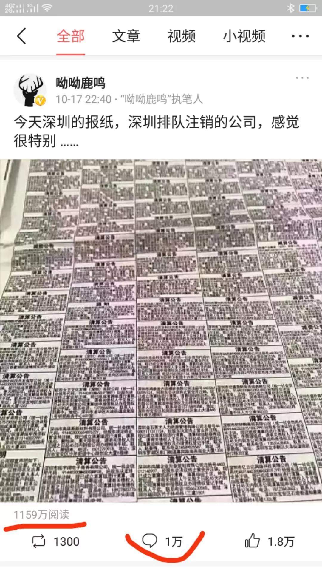 偶然看到了深圳報紙,密密麻麻全部是企業清算的公告。便發了一句話,不想,閲讀人數超過一千萬,評論一萬條,評論區無盡心酸,感同身受。似乎每一則清算公告背後,都可以聽到一個夢想破裂的聲音。