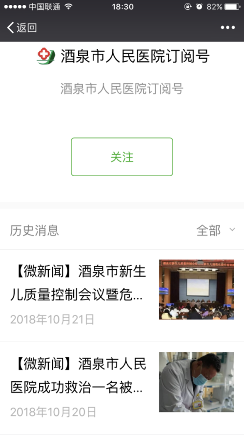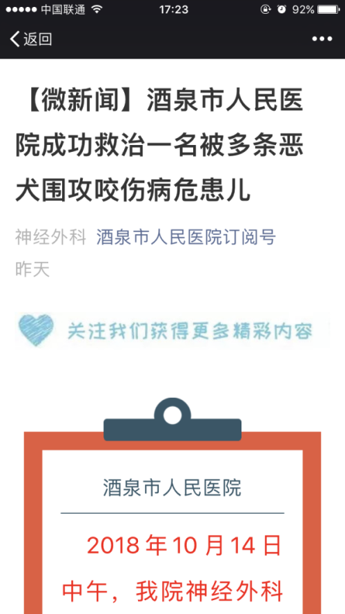 10月21日,澎湃新聞在微信公號“酒泉市人民醫院訂閲號”上看到了這一題為《酒泉市人民醫院成功救治一名被多條惡犬圍攻咬傷病危患兒》的圖文。該公眾號並無認證,但澎湃新聞通過酒泉市人民醫院官網信息,確認該號的確是醫院微信平台之一。