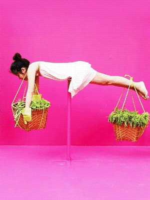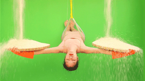 在糖果般斑斕豔麗的佈景面前,畫面中的女子將自己從繩索上吊起,閉上雙眼,伸出雙臂,支撐着兩個寬扁的籃子。