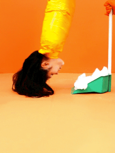 Kawita將自己的身體變為各種最直接的工具,甚至以脖子、肩膀、腳踝作為支撐,以自己的身體替代掃把、濕抹布、毛刷、簸箕…… 以此演繹着各類勞作時的場景。