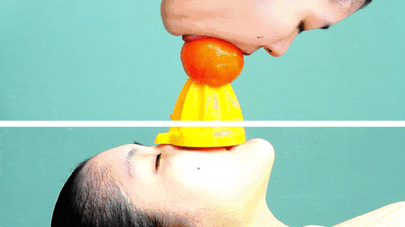 舉起的雙腳則支撐着一個裝滿了大塊西瓜的塑料筐,從上方砸來的西瓜不斷撞擊籃子,並濺在Kawita身上,但她卻沒有任何表情,以一種近乎決絕的方式堅持着。