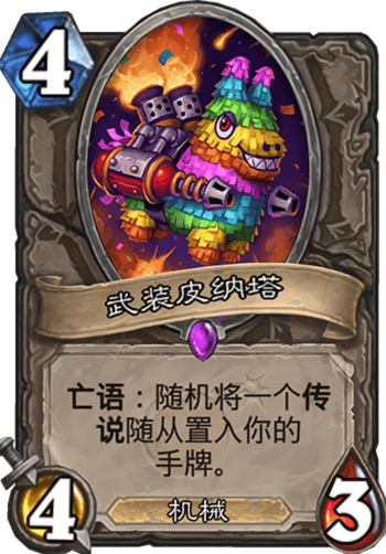 恰好,在前不久剛剛上線的《爐石傳説》最新資料片“砰砰計劃”裏,有眼尖的玩家也發現這隻小馬駒又混進了牌堆。443的身材有點吃虧,然而配上亡語隨機獲得一張傳説隨從的效果就不一樣了,卡牌的上限立刻被無限拉大,下限最多就是虧一費身材。小皮強度或許不高,但喜歡它的玩家們並不會在乎,只要它能帶來表演效果和意外的驚喜就好了嘛。如果你細心觀察的話,會發現《爐石傳説》裏的武裝皮納塔有這麼一段描述:沒關係,去砸吧,它們不會生氣的。