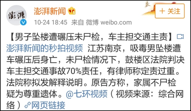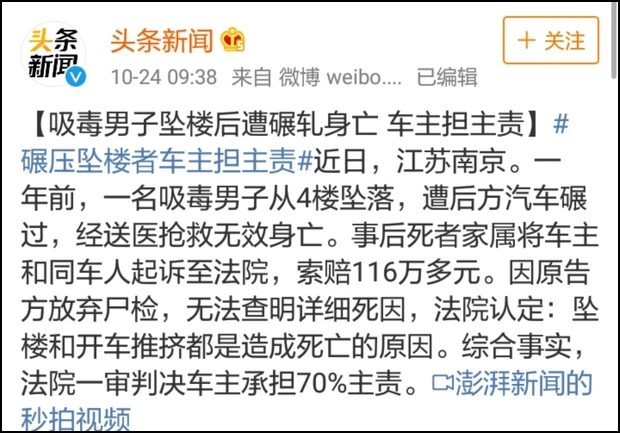 去年10月,江蘇南京一名吸毒男子墜樓,遭到後車碾壓,送醫後搶救無效身亡。事後,死者家屬向後車司機、同車乘客及車輛保險公司提起民事訴訟,要求賠償百萬。近日南京鼓樓法院宣判,車主負交通事故70%的主要責任。