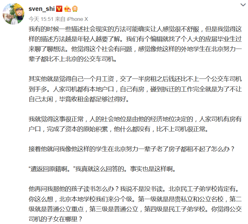 我有的時候一些描述社會現實的方法可能確實讓人感覺很不舒服,但是我覺得這樣的描述方法越是年輕人越要了解。我們有個編輯就找了個人大的應屆畢業生過來聊了聊想法。他覺得這個社會有問題,感覺像他這樣的外地學生在北京努力一輩子都比不上北京的公交車司機。