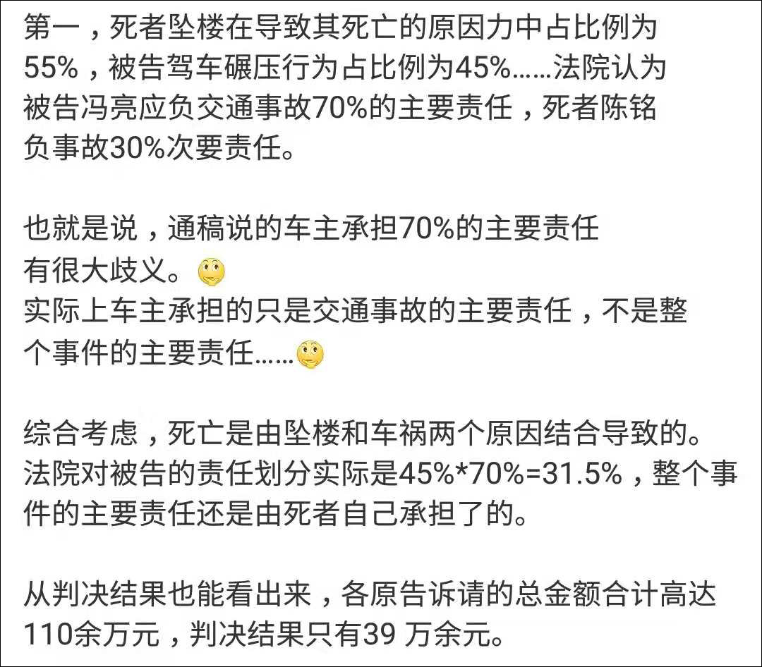 第一,死者墜樓在導致其死亡的原因力中佔比例為 55%,被告駕車碾壓行為佔比例為45%……法院認為被告馮亮應負交通事故70%的主要責任,死者陳銘負事故30%次要責任。
