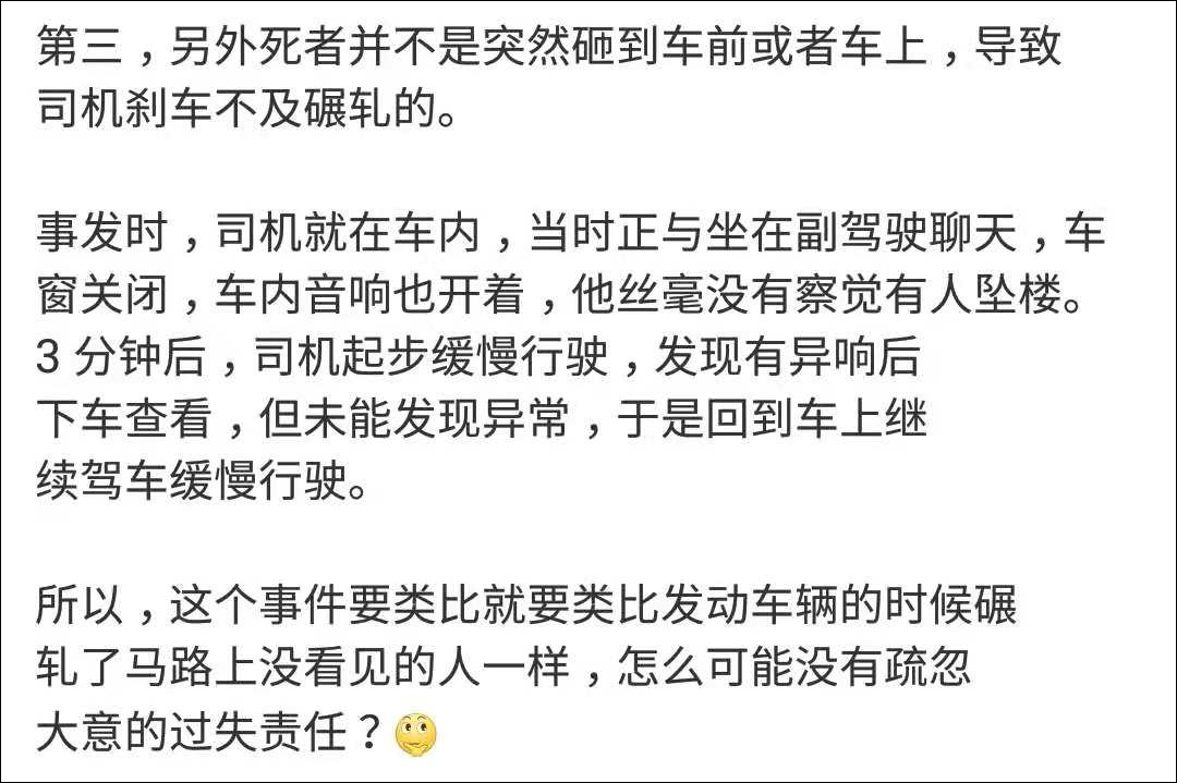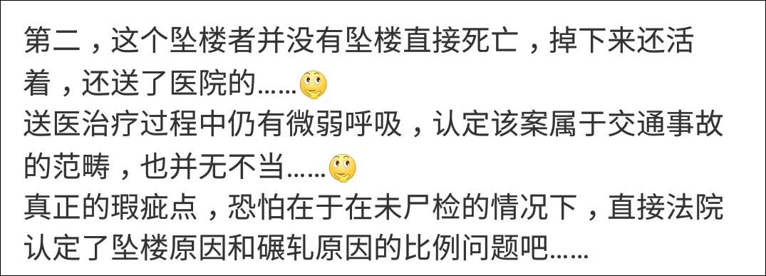 真正的瑕疵點,恐怕在於在未屍檢的情況下,直接法院認定了墜樓原因和碾軋原因的比例問題吧……