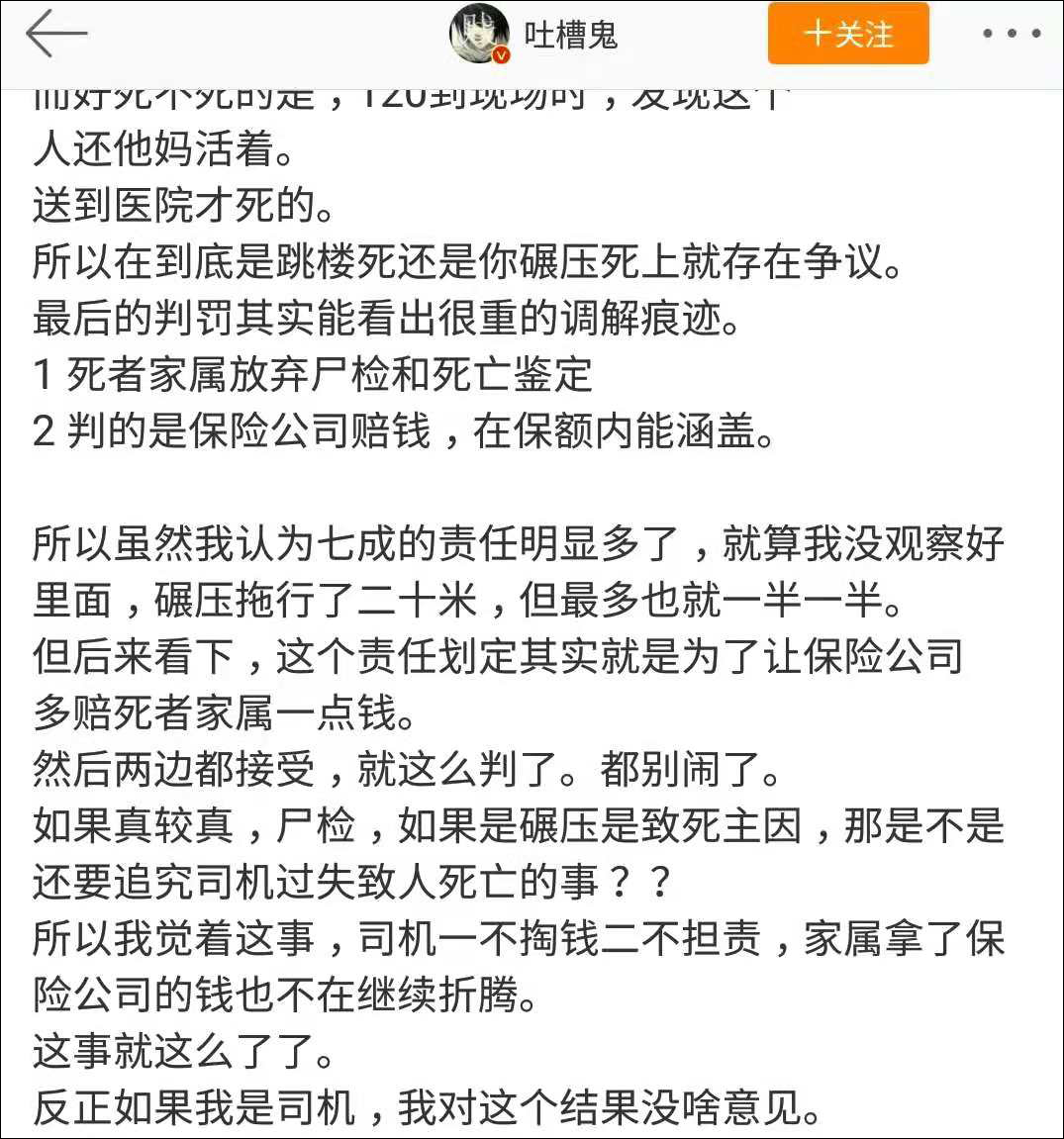 吐槽鬼説,其實判罰可以看出明顯的調解痕跡,因為死者家屬放棄了屍檢和死亡鑑定,另外判決書中提到的是保險公司賠錢而且保額能夠涵蓋。
