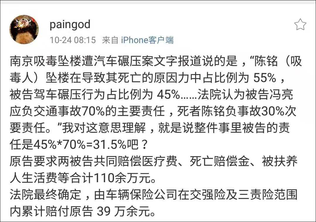 吸毒男墜樓遭司機碾壓 南京法院判的這個案子網友又不是很滿意_風聞