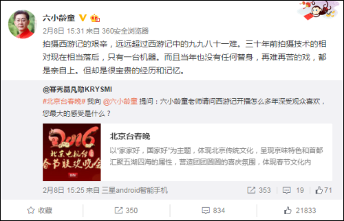 如果大家有印象,2016年的猴年春節聯歡晚會籌備階段,當網友們知道猴年春晚沒有六小齡童時,義憤填膺的跑到當時春晚導演呂逸濤微博下面,要求增加一個六小齡童扮演孫悟空的節目。呂逸濤當時最新的一條微博發表於12月31日,截至春晚播出,微博下的評論已經高達200多萬。