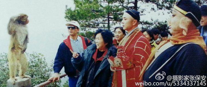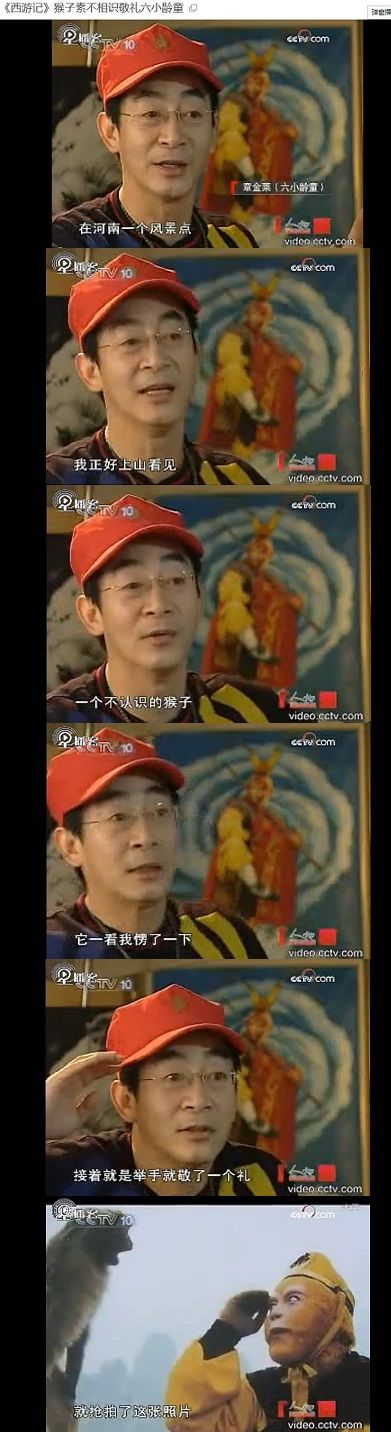 大家應該都見過這一張圖片。六小齡童自己在很多場合都説過,當時是自己扮上妝後,有一隻小猴子便跑了過來,向自己敬了個禮。