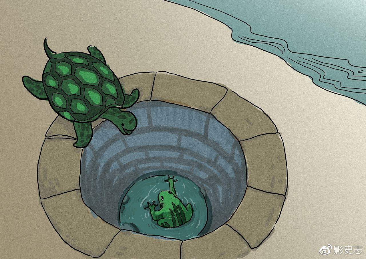 住在井底的青蛙,認為天就井口那麼大,水就井中那麼多。之後來了只東海之鱉,告訴青蛙:井外有廣闊的世界,無邊無際的大海,深邃高遠的天空。