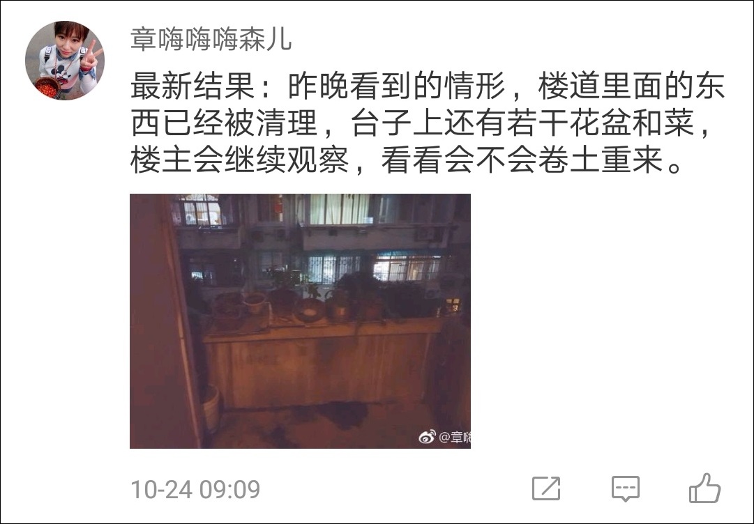 而據網友透露,到23日晚,“樓道里面的東西已經被清理,台子上還有若干花盆和菜”。