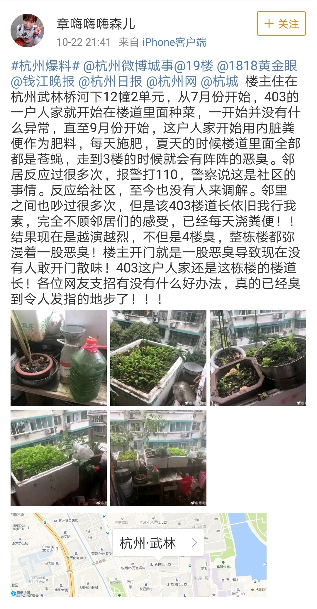 家住杭州武林橋河下12幢2單元的網友@章嗨嗨嗨森兒 22日在社交媒體上發文曝光此事。