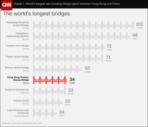 大橋通車的消息也登上《紐約時報》、英國廣播公司(BBC)等外媒。美國有線電視新聞網(CNN)也盤點出全球9座最長的橋樑,港珠澳大橋以55公里的長度排名第六位。而台灣媒體則關注到,在這份榜單上,彰化-高雄高架橋排名第2。