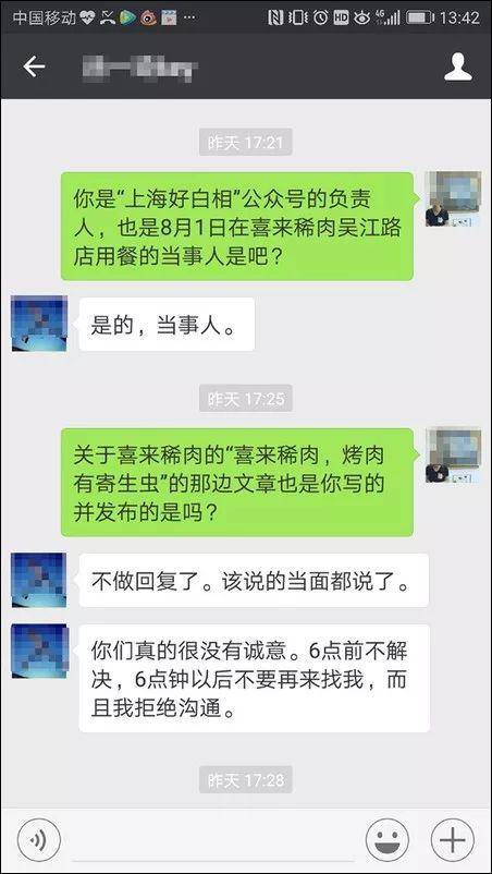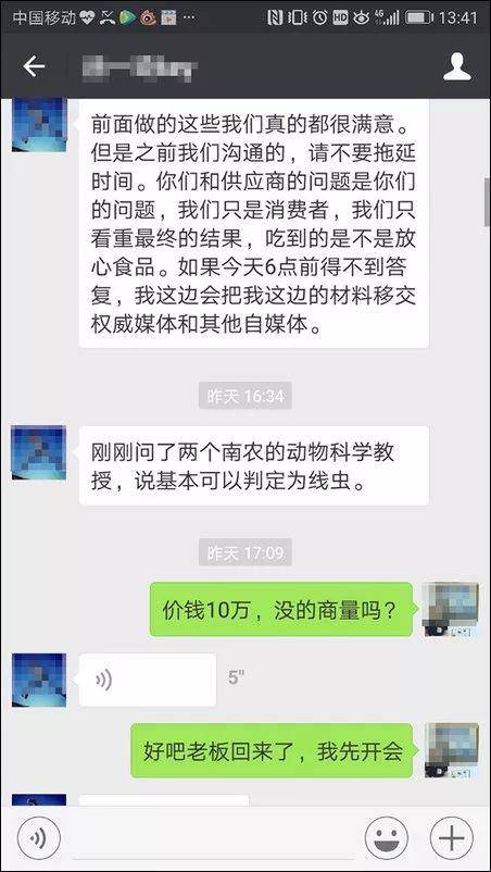 為此,“喜來稀肉”微信公眾號8月2日發文稱,那不是寄生蟲,而是豬血管。並稱公司已經和上述微信公眾號溝通,接洽的“徐先生”提出要10萬元封口費,下午六點前到賬,否則將再次發送推文。事後查明,“喜來稀肉”豬肉沒問題,而公司也向“上海好白相”提出8萬元的索賠。