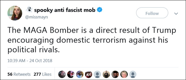 “MAGA Bomber是特朗普鼓勵用恐怖主義對抗政治對手的直接結果。”