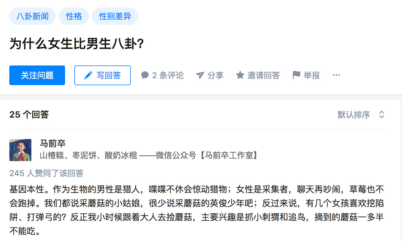 我在知乎搜索過“為什麼女性熱愛八卦?”。