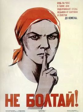 (前蘇聯戰時宣傳海報及印有一名女性,配字為:停止喋喋不休,八卦可能導致叛國罪!)