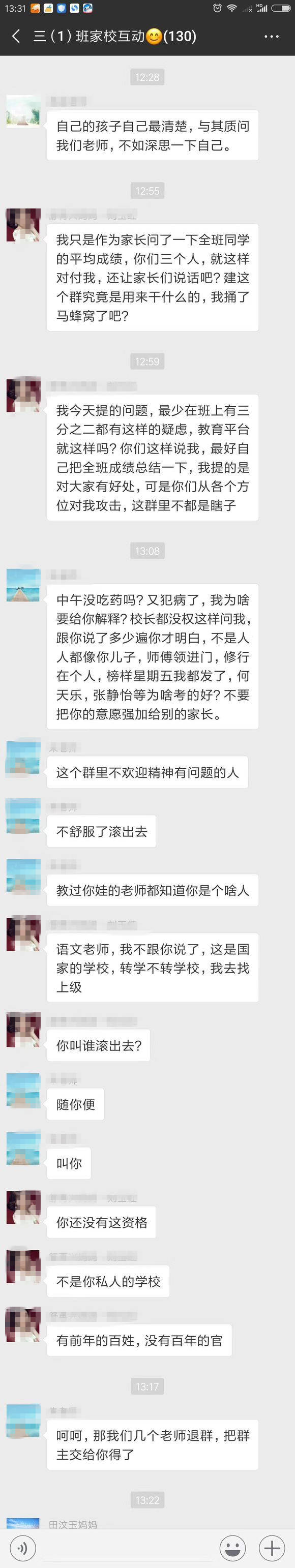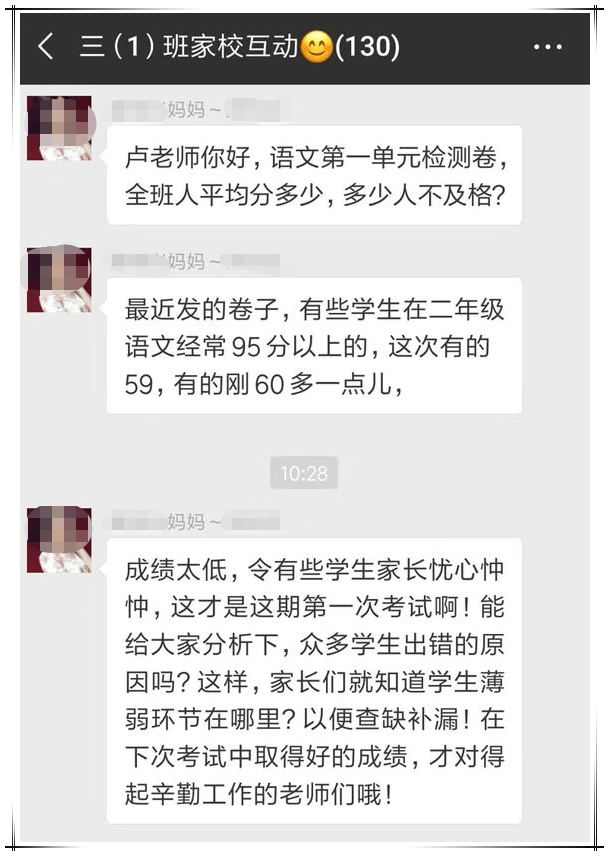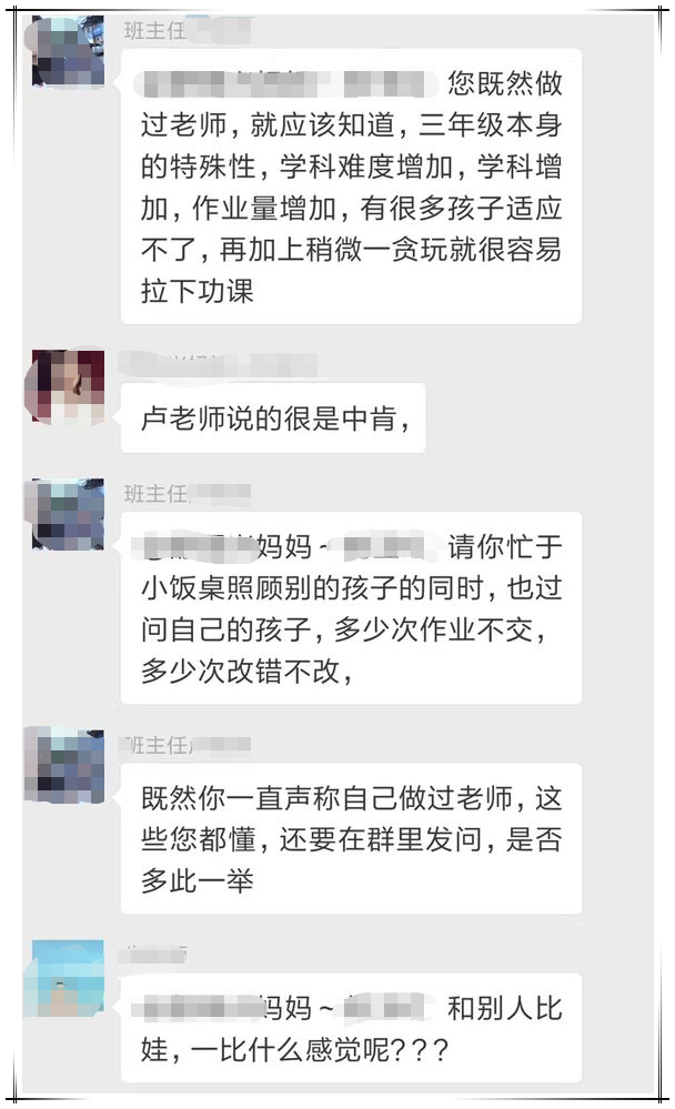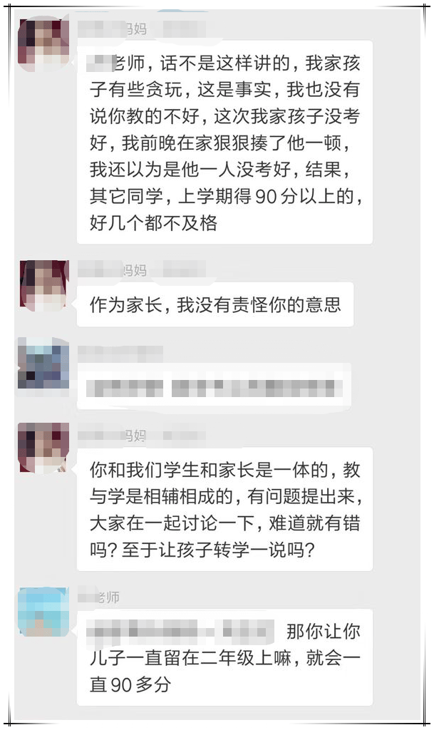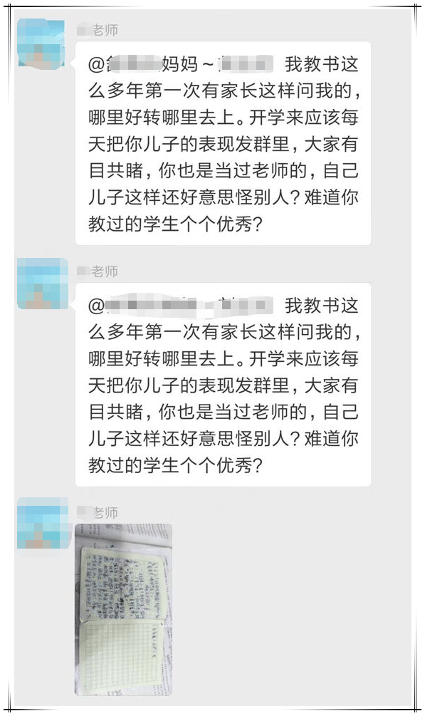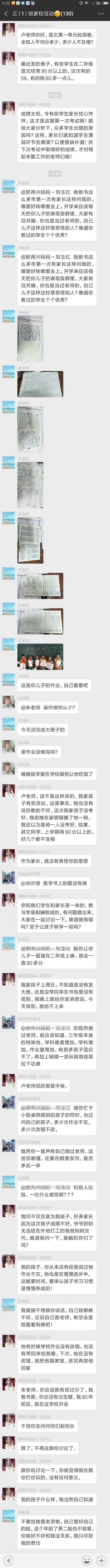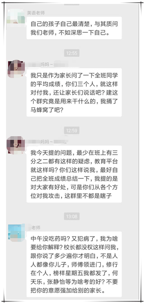 我們來概括一下,家長覺得這次考試,不光自己孩子沒考好,班上同學都沒有考好,希望老師出來説個解決方法(説實話,這位家長口氣還確實挺像個老師的)。語文老師就覺得自己受到了冒犯,並説自己對於班內考的好的同學(“榜樣”)已進行過表揚,希望家長對於自己孩子沒有考好的事情,找一下自己的原因。然後雙方在家校互動羣內多次往來互動,期間還有班主任和英語老師發言。