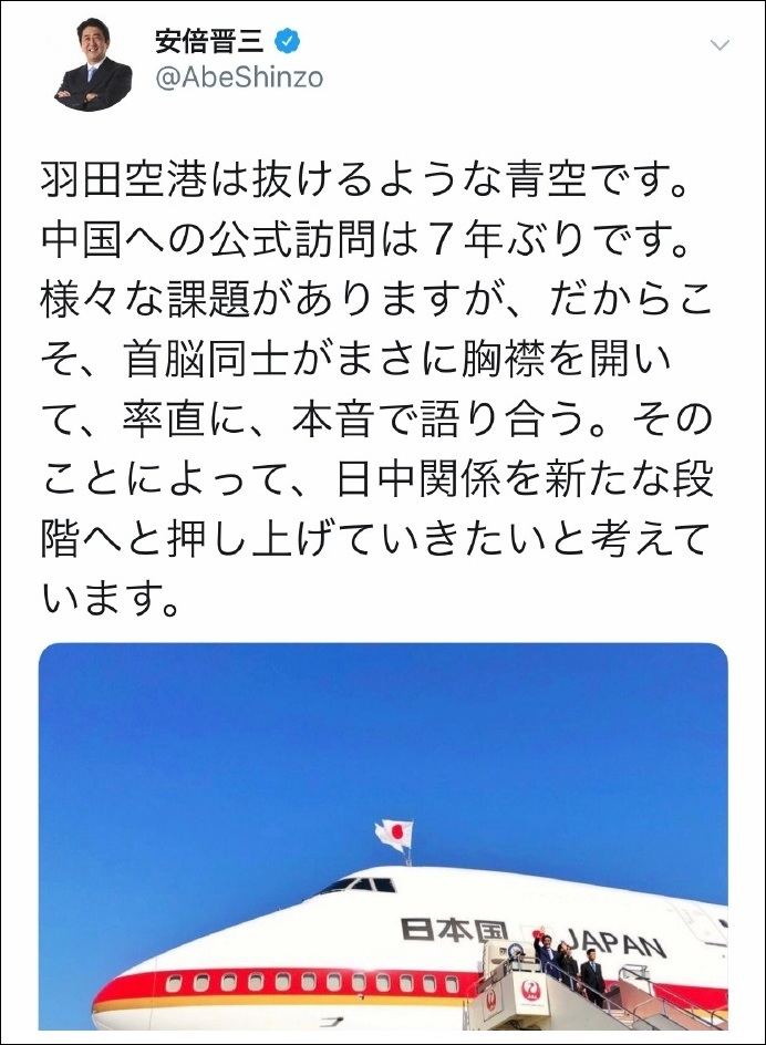 日本首相安倍晉三臨行前發推文對訪華之行表示期待