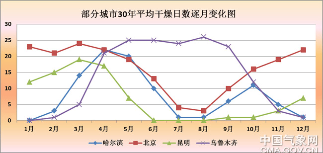 如北京、石家莊等城市冬春季節都比秋季乾燥;而哈爾濱、長春、瀋陽等城市春季最乾燥,秋季次之;昆明、西安、成都等地秋季多雨,所以比較濕潤;烏魯木齊最特殊,最乾燥的季節不在冬春,也不在秋季,竟然在夏季,主要是因為夏季此地氣温高,蒸發大,加之降水較少,所以相對最為乾燥。